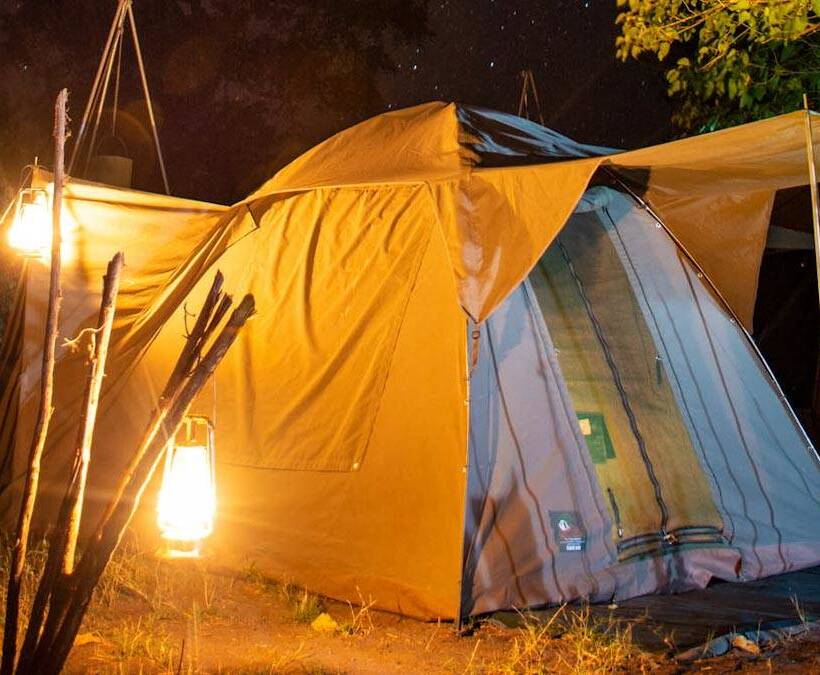 No need to set your tent up. we provide tents with en-suite shower and bush toilets. Dining area is covered by a dining tent with table and chairs.